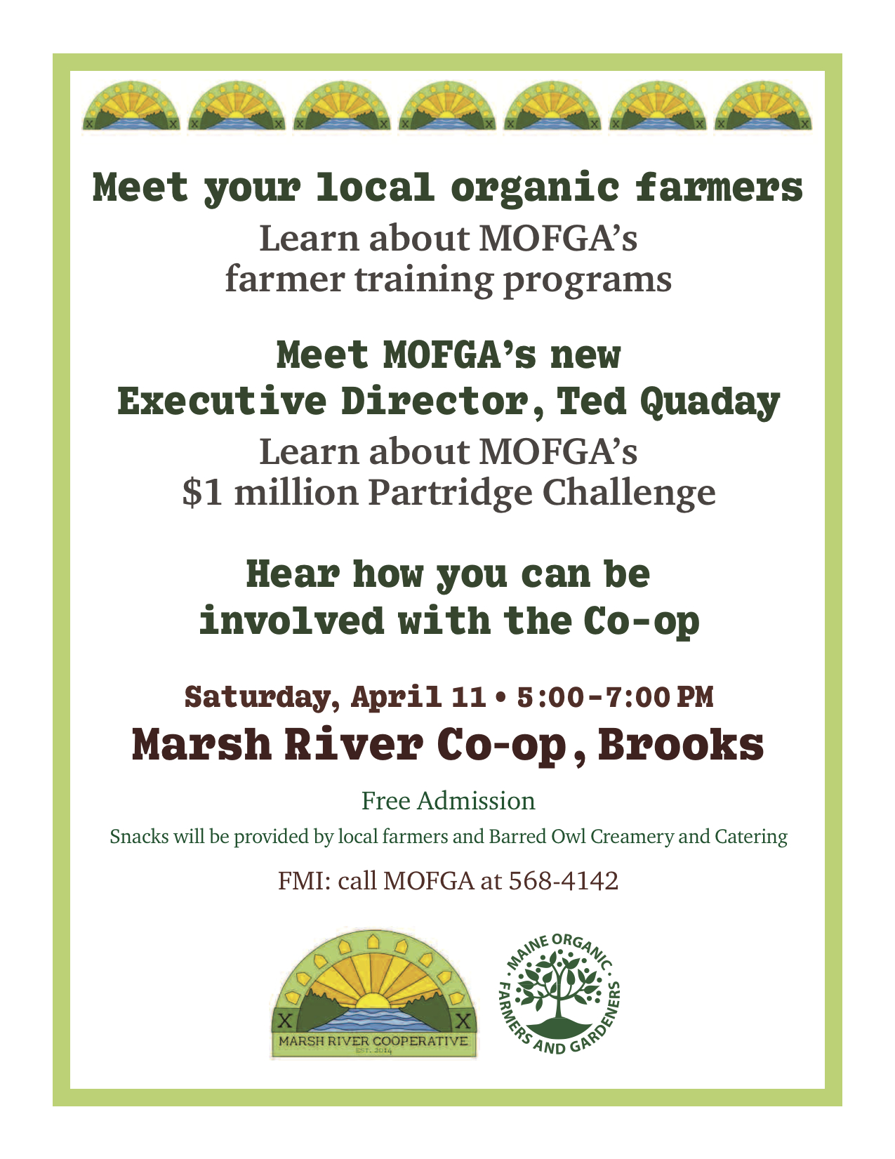 Join us tomorrow, April 11th, at the Marsh River Co-op as we celebrate our local farmers, welcome MOFGA’s Executive Director Ted Quaday, and hear the details on a Partridge Family Matching Grant recently awarded to MOFGA to support their educational programs!