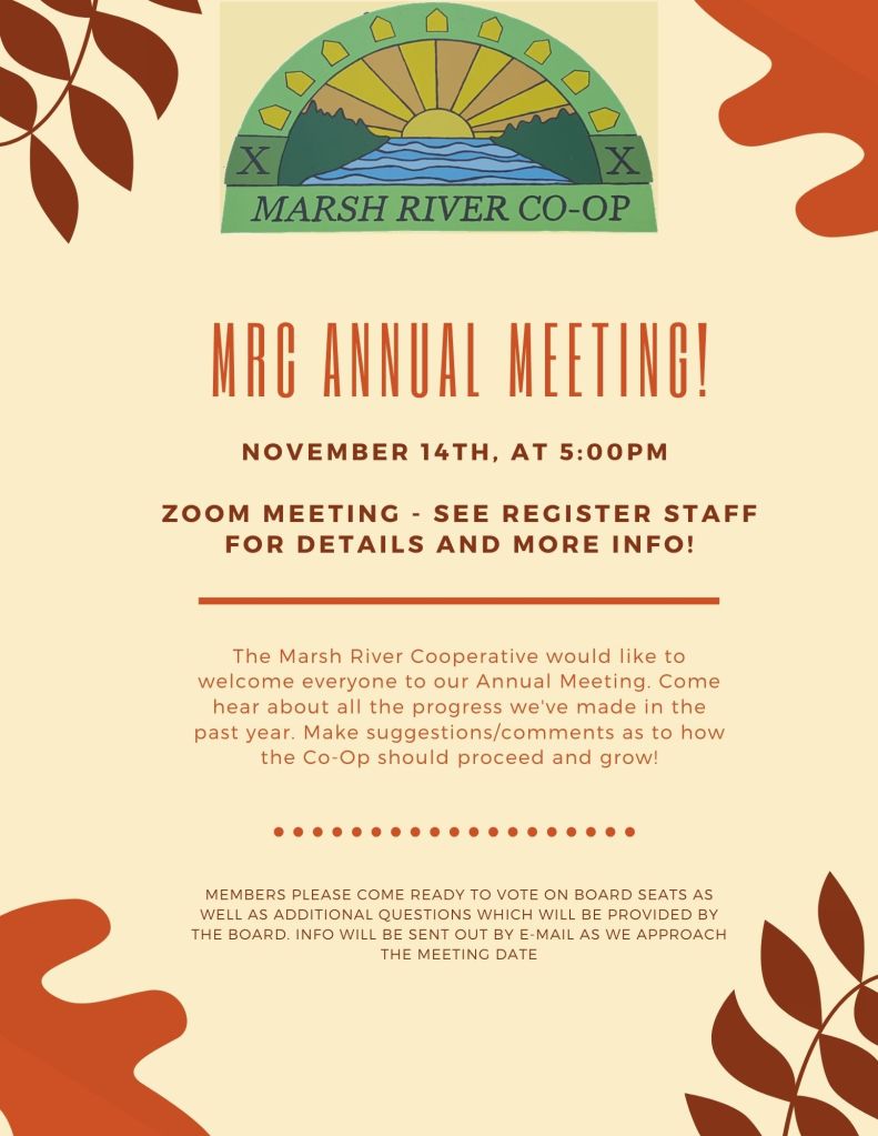 Just working on the planning for the upcoming board meeting on November the 14th at 5pm via Zoom. We’ve finalized the agenda which we have posted below and we are hoping to have the slate of new board members and the Annual Report ready by the end of this week. If you wish to attend to receive the instructions please give your email address at the register or email marshrivercooperative@gmail.com.
