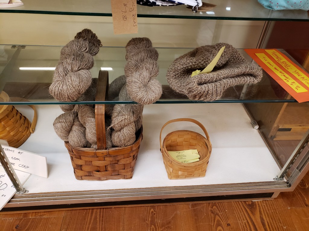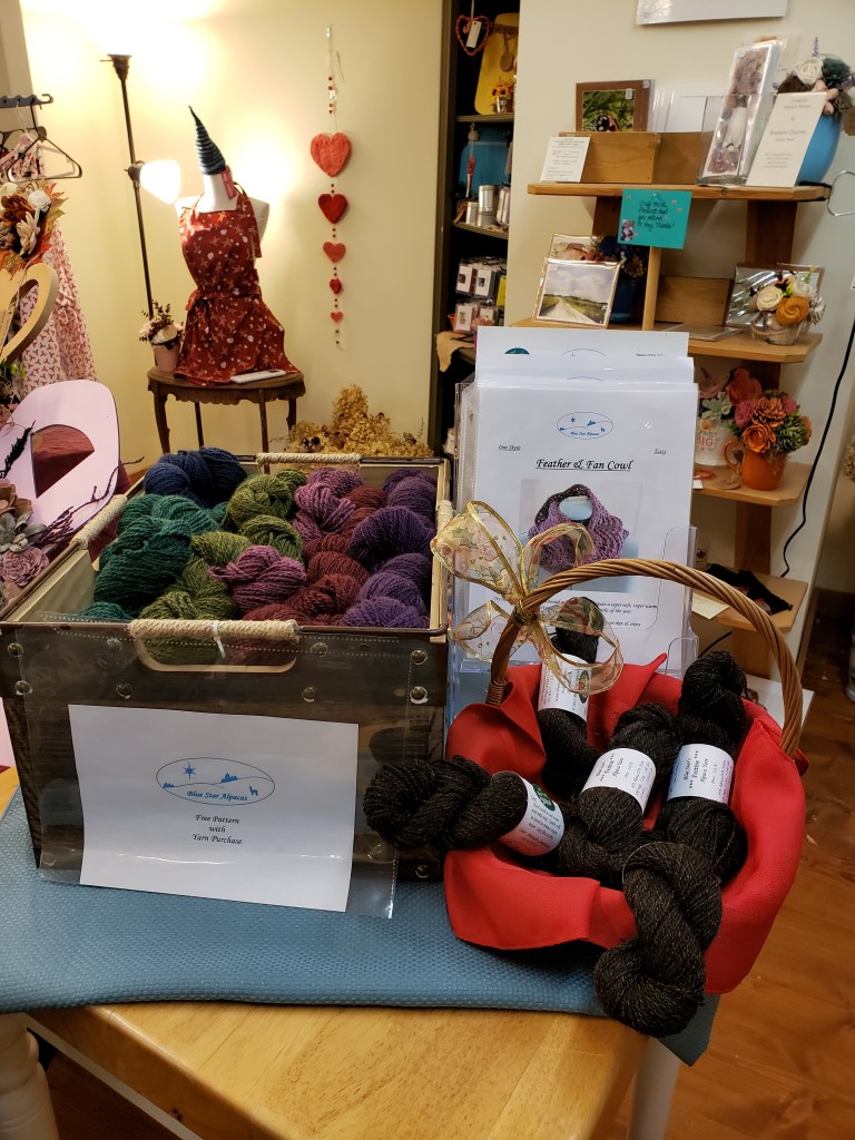 If you are looking for local yarn as well we have skeins of wool from Blue Star (Marty) that is alpaca blend and from Tramps Rest (Charles)!